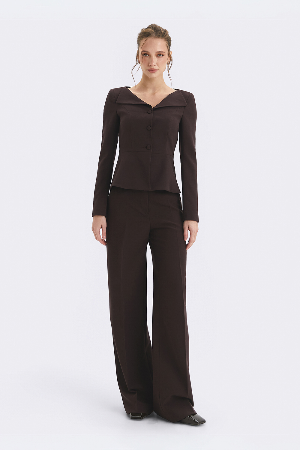 Штани шоколадного кольору можна стилізувати як для ділових, так і для повсякденних розслаблених образів. Штани середньої посадки. Штанини з запрасованими стрілками візуально подовжують ноги. Застібка на блискавку і гачок.Рекомендуємо доповнити образ жакетом з такої ж тканини.