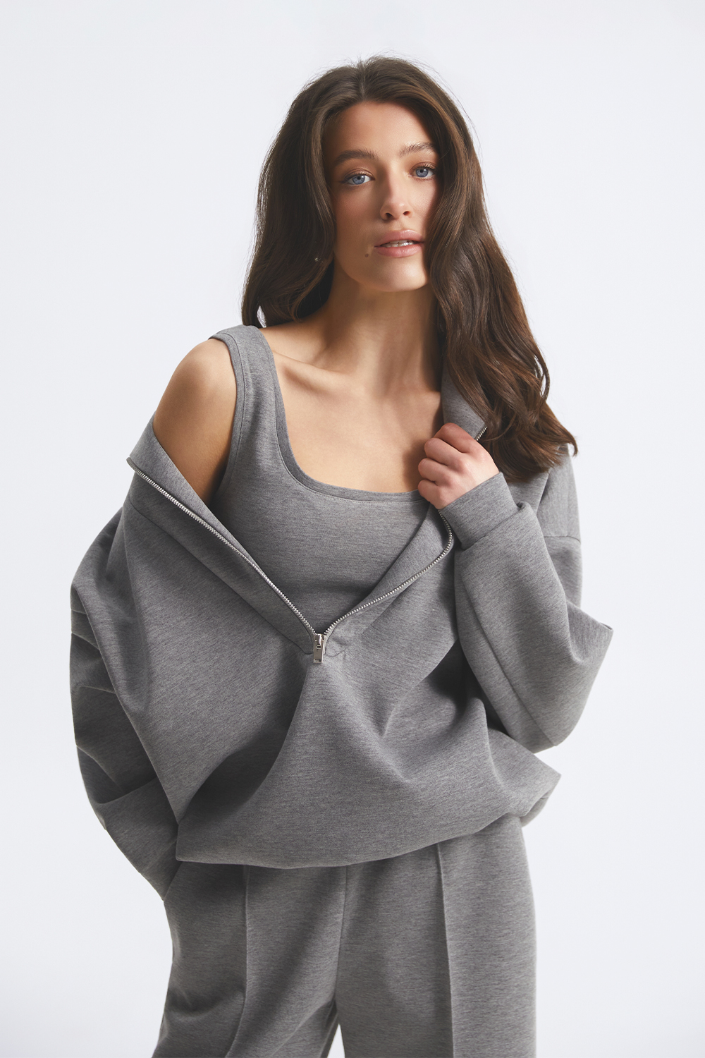 Вільний світшот для комфортних образів. Комір-стійку можна перетворити на V-подібний виріз за допомогою блискавки, а посадку відрегулювати завдяки резинці з регуляторами внизу світшота. Зручні манжети та опущена лінія плеча надають всім образам з ним розслабленого вигляду.