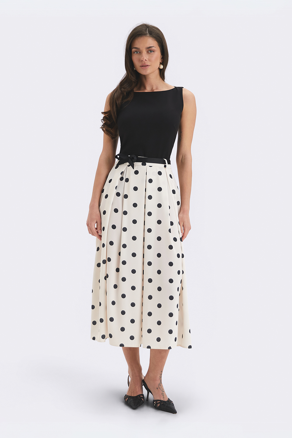 Штучний важкий шовк з гладкою поверхнею і дорогим легким блиском. Красиво переливається в русі. Облягає фігуру, не обтягуючи її. У складі тканини присутній поліестер і еластан, що надає тканині пружності. Авторський принт - Polka Dot. Нанесення didgital.